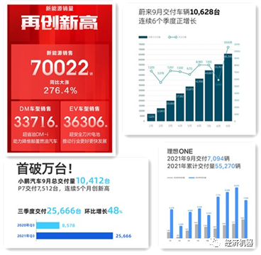 造车新势力中,在8月出现交付严重下滑的蔚来汽车,终于在9月迎来了久违的高光时刻,交付新车10628辆,同比增长125.7%。另一新势力成员小鹏汽车9月交付新车10412辆,实现销量破万成绩,仅与第一名蔚来相差216辆,环比增幅达到44%。受芯片短缺影响,理想汽车9月交付新车7094辆,环比下降24.8%。