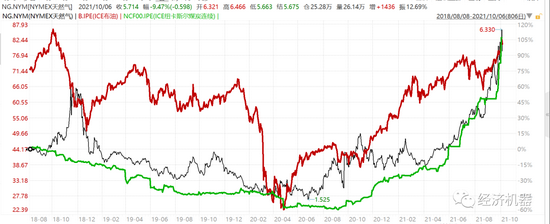 图1、纽约天然气期货(黑)、纽卡斯尔煤炭期货(绿)和布油(红)价格